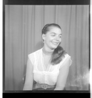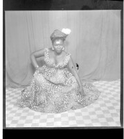 Full frontal view of a woman sitting in the studio wearing a robe pagne (wrapper dress) and head scarf, in between a boy and a little girl standing facing forward.