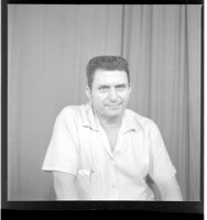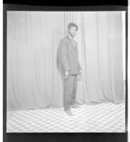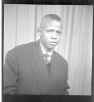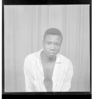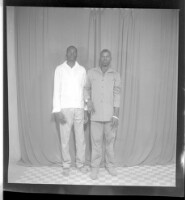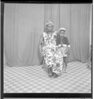 Full frontal view of a woman sitting in the studio wearing a robe pagne (wrapper dress), head scarf, and necklace. A little boy stands next to her wearing a shirt, shorts, and a kepi.