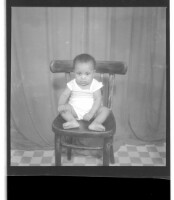 79. EAP449/2/15/79 Reference (shelfmark): EAP449/2/15/79 Title: A baby wearing a t-shirt sitting face-forward on a chair in the studio. Collection Area: Endangered Archives Programme Languages: Not applicable Date Range: 2nd half od the 20th century Extent: 1 TIFF image