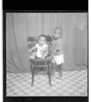 80. EAP449/2/15/80 Reference (shelfmark): EAP449/2/15/80 Title: A baby wearing a t-shirt sitting face-forward on a chair next to a boy standing face-forward in the studio. Collection Area: Endangered Archives Programme Languages: Not applicable Date Range: 2nd half od the 20th century Extent: 1 TIFF image