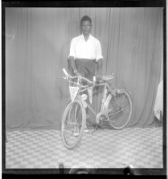 798. EAP449/2/15/798 Reference (shelfmark): EAP449/2/15/798 Title: Full frontal view of a man standing in the studio wearing a shirt and shorts and holding a bike. Collection Area: Endangered Archives Programme Languages: Not applicable Date Range: 2nd half od the 20th century Extent: 1 TIFF image