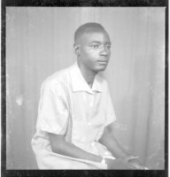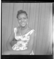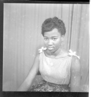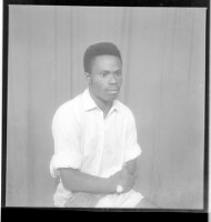 A woman wearing a robe pagne (wrapper dress) and head scarf, putting her hand on a man's shoulder. The man is wearing a shirt and pants. Both are standing profile view in the studio.