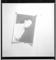 866. EAP449/2/15/866 Reference (shelfmark): EAP449/2/15/866 Title: A woman wearing a dress, head scarf, and necklaces, standing in the studio behind a frame. Collection Area: Endangered Archives Programme Languages: Not applicable Date Range: 2nd half od the 20th century Extent: 1 TIFF image
