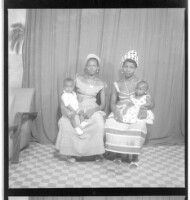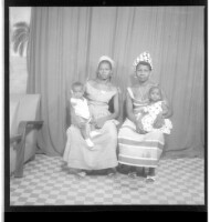 864. EAP449/2/15/864 Reference (shelfmark): EAP449/2/15/864 Title: Two women wearing robes pagnes (wrapper dresses), head scarves, and chain necklaces, each with a baby on their lap. Taken in the studio. Collection Area: Endangered Archives Programme Languages: Not applicable Date Range: 2nd half od the 20th century Extent: 1 TIFF image