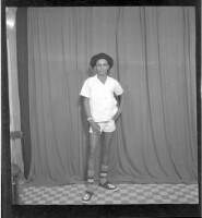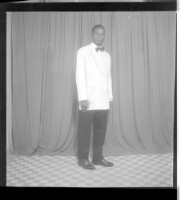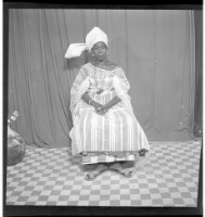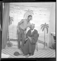 A man wearing a shirt and pants leaning over, profile view, next to a man sitting profile view wearing a boubou, cap, and glasses. Taken in the studio.