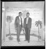 Two men wearing shirts, one of whom is also wearing sunglasses; both are standing, one from profile view and the other facing forward. Taken in the studio.