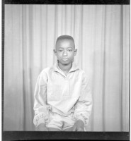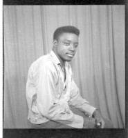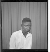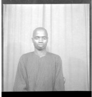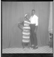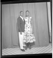A man wearing a shirt and pants, standing full frontal view next to a woman standing profile view, wearing a robe pagne (wrapper dress), head scarf, and chain necklace. Taken in the studio.