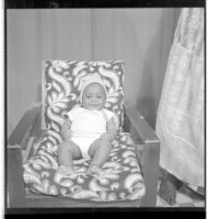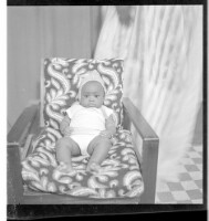 176. EAP449/2/17/176 Reference (shelfmark): EAP449/2/17/176 Title: A baby wearing a T-shirt, shorts, and a cap sitting profile view on a chair in the studio. Collection Area: Endangered Archives Programme Languages: Not applicable Date Range: 2nd half od the 20th century Extent: 1 TIFF image