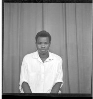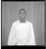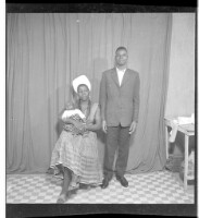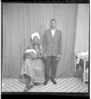 A man wearing a jacket and pants standing full frontal view next to a woman wearing a loose dress, head scarf, and necklaces. She is holding a baby in her lap. Taken in the studio.