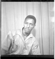 A man wearing a shirt sitting profile view in the studio next to a woman sitting full frontal view and wearing a dress, head scarf, and a necklace. Taken in the studio.