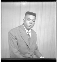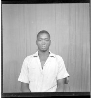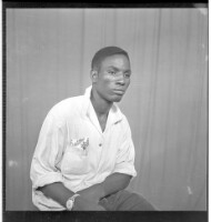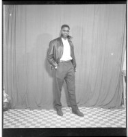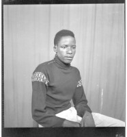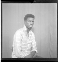 Four men wearing boubous, three of whom are also wearing caps. Two are sitting full frontal view in front of the two others who are standing full frontal view. Taken in the studio.