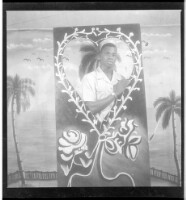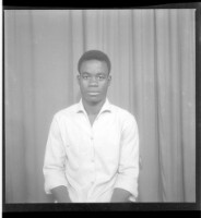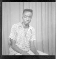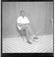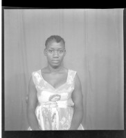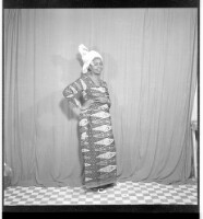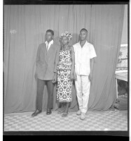 A woman wearing a robe pagne (wrapper dress) and a necklace standing full frontal view between two men. One is standing full frontal view wearing a jacket, tie, and pants and the other is wearing a shirt and pants, standing profile view. Taken in the stud