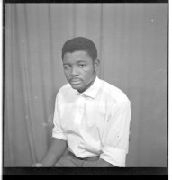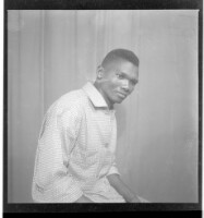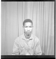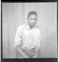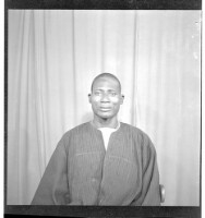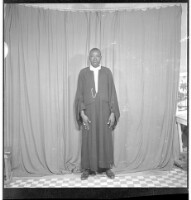 A girl wearing a dress sitting full frontal view in front of a man wearing a jacket and pants, sitting profile view. He is next to a woman wearing a dress, head scarf, and necklaces sitting full frontal view in front of four men. Three of them are wearing