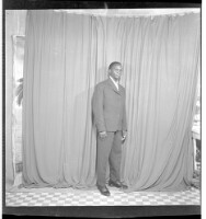 395. EAP449/2/17/395 Reference (shelfmark): EAP449/2/17/395 Title: Profile view of a man standing in the studio wearing a suit. Collection Area: Endangered Archives Programme Languages: Not applicable Date Range: 2nd half od the 20th century Extent: 1 TIFF image