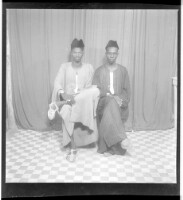 392. EAP449/2/17/392 Reference (shelfmark): EAP449/2/17/392 Title: A man wearing a shirt next to a woman wearing a dress, head scarf, and a necklace, both sitting profile view in the studio. Collection Area: Endangered Archives Programme Languages: Not applicable Date Range: 2nd half od the 20th century Extent: 1 TIFF image