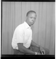 A man wearing a shirt sitting profile view next to a woman sitting full frontal view and wearing a dress, head scarf, and a chain necklace. Taken in the studio.