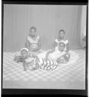Two little girls wearing dresses and head scarves, both laying down; one from profile view and the other facing forward. They are in front of two girls wearing dresses, one of whom is also wearing a necklace. Both are sitting full frontal view. Taken in t