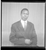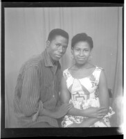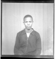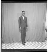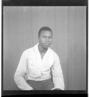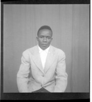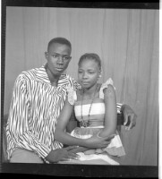 A man wearing a shirt, pants, and a borsail (cap) standing full frontal view with his hand on the shoulder of a man wearing a boubou and a cap, sitting full frontal view in the studio.