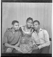 434. EAP449/2/17/434 Reference (shelfmark): EAP449/2/17/434 Title: A woman wearing a robe pagne (wrapper dress) and a necklace in between two mean wearing shirts and pants, both sitting profile view in the studio. Collection Area: Endangered Archives Programme Languages: Not applicable Date Range: 2nd half od the 20th century Extent: 1 TIFF image