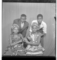 438. EAP449/2/17/438 Reference (shelfmark): EAP449/2/17/438 Title: Two women wearing robes pagnes (wrapper dresses) and necklaces, sitting full frontal view in front of two men, one of whom is wearing a suit and the other is wearing a shirt and pants. Both are leaning over, facing forward. Taken in the studio. Collection Area: Endangered Archives Programme Languages: Not applicable Date Range: 2nd half od the 20th century Extent: 1 TIFF image