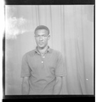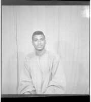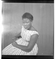 Two women wearing robes pagnes (wrapper dresses) and head scarves, one of whom is holding a baby on her lap. She is sitting full frontal view. The other is sitting profile view. Taken in the studio.