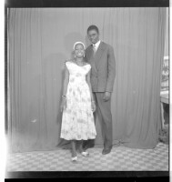 A man wearing a suit, tie, and glasses standing profile view next to a woman wearing a dress, head scarf, and necklace standing full frontal view in the studio.