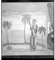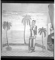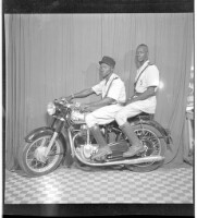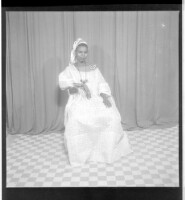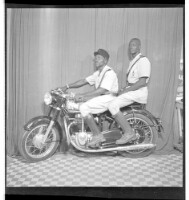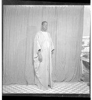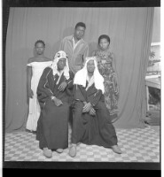 Two men wearing boubous and head scarves sitting profile view in front of a man wearing a shirt in between two girls wearing dresses, one of whom is wearing a chain necklace. They're all standing full frontal view in the studio.
