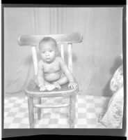 A boy wearing a shirt, pants, and a hat in front of three men wearing shirts. One of them is wearing pants and two are wearing shorts. One is wearing glasses. All three men are sitting full frontal view. Behind them are five men, one wearing a suit and th
