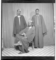 52. EAP449/2/17/52 Reference (shelfmark): EAP449/2/17/52 Title: Three men in the studio wearing boubous, one of whom is sitting profile view and two are standing full frontal view behind him. Collection Area: Endangered Archives Programme Languages: Not applicable Date Range: 2nd half od the 20th century Extent: 1 TIFF image