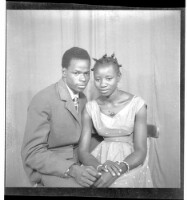 57. EAP449/2/17/57 Reference (shelfmark): EAP449/2/17/57 Title: A man wearing a suit and tie next to a woman wearing a dress, both sitting profile view in the studio. Collection Area: Endangered Archives Programme Languages: Not applicable Date Range: 2nd half od the 20th century Extent: 1 TIFF image