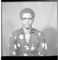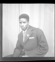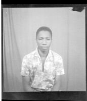 Full length portrait of three people, to the left a standing man wearing a shirt and black, in the middle a young girl stands wearing a dress, a necklace and a white head scarf, to the right a man stands wearing a grey t-shirt and black pants, all facing