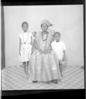 Full length portrait of three people, a woman sitting wearing a grey boubou, a necklace, a head scarf and earrings, with a little girl wearing a white dress, a necklace and a head scarf, all facing forward