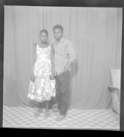 Full length shot of a couple, a man standing wearing a grey shirt, black pants, his hand in his pocket with a woman standing wearing a dress and a hairstyle, facing forward