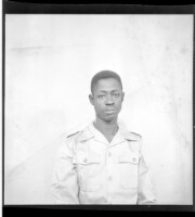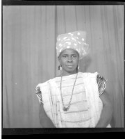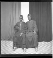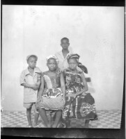 Full length portrait of three people; a man standing wearing a military uniform and a woman wearing a robe and a head scarf and a baby, all facing forward