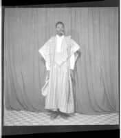 702. EAP449/2/17/702 Reference (shelfmark): EAP449/2/17/702 Title: A man standing wearing a white shirt and a grey boubou, facing forward with a cigarette in his mouth Collection Area: Endangered Archives Programme Languages: Not applicable Date Range: 2nd half od the 20th century Extent: 1 TIFF image
