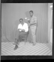 710. EAP449/2/17/710 Reference (shelfmark): EAP449/2/17/710 Title: Full length portrait of two men, one sitting wearing a white shirt, black pants and black glasses, arms and legs crossed, facing forward and a young man standing, his right arm is raised in greeting, wearing a grey shirt and facing sideways Collection Area: Endangered Archives Programme Languages: Not applicable Date Range: 2nd half od the 20th century Extent: 1 TIFF image
