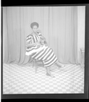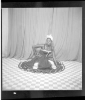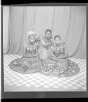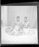 Full portrait of two young girls sitting on the ground wearing a tussu dresses, the girl on the right wearing a necklace, touching the other girl, facing forward