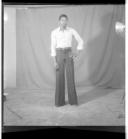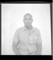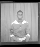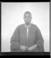 A couple, a man sitting wearing a white shirt, a full black suit, a pen in his pocket and a watch, with a woman sitting wearing a dress and a head scarf, facing forward