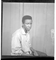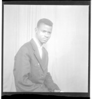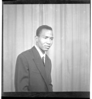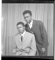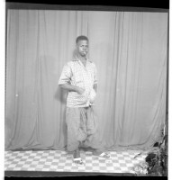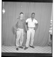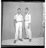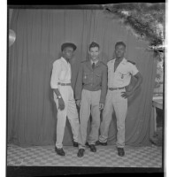 A man wearing a shirt, pants, and a beret standing profile view next to two men wearing military uniforms and standing full frontal view. Taken in the studio.