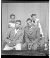 Two men wearing jackets and pants, both sitting in the studio, one of whom is sitting profile view and the other is sitting full frontal view. Behind them are two little girls standing full frontal view and wearing dresses.