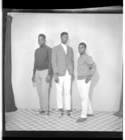806. EAP449/2/17/806 Reference (shelfmark): EAP449/2/17/806 Title: A man wearing a suit jacket and pants between two men in long sleeve shirts and pants, all standing and facing sideways Collection Area: Endangered Archives Programme Languages: Not applicable Date Range: 2nd half od the 20th century Extent: 1 TIFF image