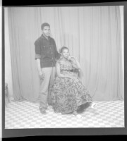 810. EAP449/2/17/810 Reference (shelfmark): EAP449/2/17/810 Title: A man wearing a shirt and pants, standing and facing sideways next to a women wearing a dress and a head scarf, sitting and facing sideways Collection Area: Endangered Archives Programme Languages: Not applicable Date Range: 2nd half od the 20th century Extent: 1 TIFF image