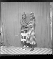 Two young ladies, on the left in a camisole outfit, many necklaces and white shoes, the girl on the right wearing a dress, necklace, headscarf. Both girls holding each other, facing forward.