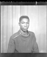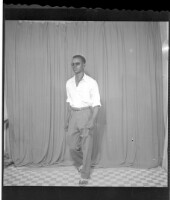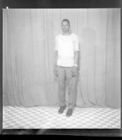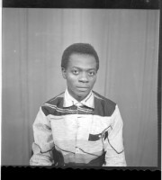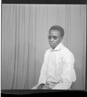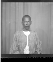 A full shot of 3 men; One sitting in the middle in a black boubou, headscarf and a gri gri. On the left a young man standing wearing a black t-shirt and pants and the man on the right wearing a grey shirt and black pants with both of his arms on his hips,
