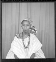 A full shot of a lady sitting down in a white boubou either her hair done, two kids are standing next to her, one little girl in a black dress with a necklace and a little boy with a white shirt on and boxers, facing forward.