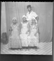 Full shot of 4 people: 3 women sitting wearing the same outfits with dresses, headscarves and necklaces and a man standing wearing a police outfit, facing forward.