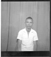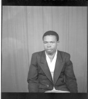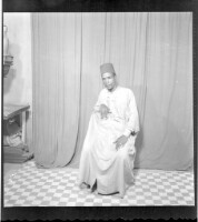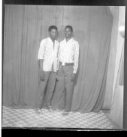 Full shot of two men standing, wearing boubous, the man on the left wearing a grey one and the man on the right with a white one, also wearing a hat and watch, facing forward.