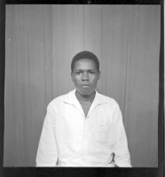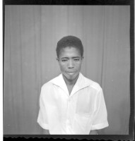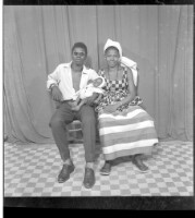 Full shot of 5 people: two women sitting, one wearing a black dress and a black headscarf with a baby wearing a white outfit. In the middle a man wearing a white boubou and a lady in a camisole, and headdress holding a baby with his eyes closed, facing f