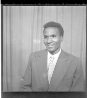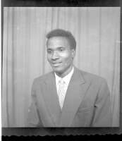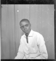 Full shot of a couple: A young man sitting, wearing a white unbuttoned shirt, black pants and black glasses holding a baby and a women sitting, wearing a camisole, necklace and white headscarf with a smile on her face, facing forward.