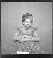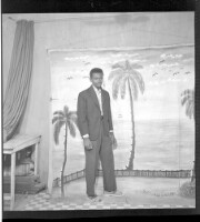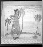 202. EAP449/2/18/202 Reference (shelfmark): EAP449/2/18/202 Title: A lady standing up, wearing a black dress, black headscarf, necklace and earrings with a background with 3 palm trees, facing forward. Collection Area: Endangered Archives Programme Languages: Not applicable Date Range: 2nd half od the 20th century Extent: 1 TIFF image